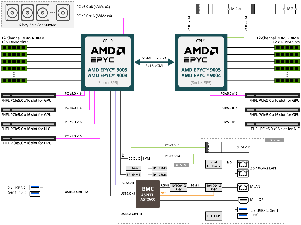 • Supports up to 4 x Dual slot Gen5 GPUs